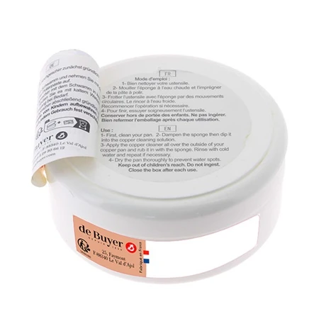 Pour utiliser efficacement la pâte à polir pour cuivre De Buyer, nous vous conseillons de passer de l’eau tiède sur les ustensiles ou récipients propres puis d’appliquer un peu de pâte sur une éponge mouillée. Frottez en effectuant de petits gestes circulaires, rincez et essuyez.