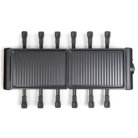 L’appareil à raclette 12 personnes est parfait pour faire des raclettes pour une grande tablée ! Sur les plateaux supérieurs, vous pourrez faire griller de la viande ou des légumes pour accompagner les pommes de terre et le fromage, qui pourra fondre lui, dans les caquelons dans la partie du bas. Les plateaux sont amovibles et antiadhérents pour les nettoyer facilement. Le thermostat ajustable permet de régler la température et contrôler vos grillades.