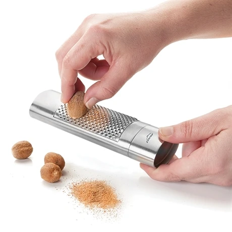 Le conteneur de la râpe à muscade stocke les aliments déjà râpés afin de les saupoudrer facilement avant la dégustation. Le compartiment est idéal pour ranger les épices entières et de ce fait les avoir sous la main facilement.